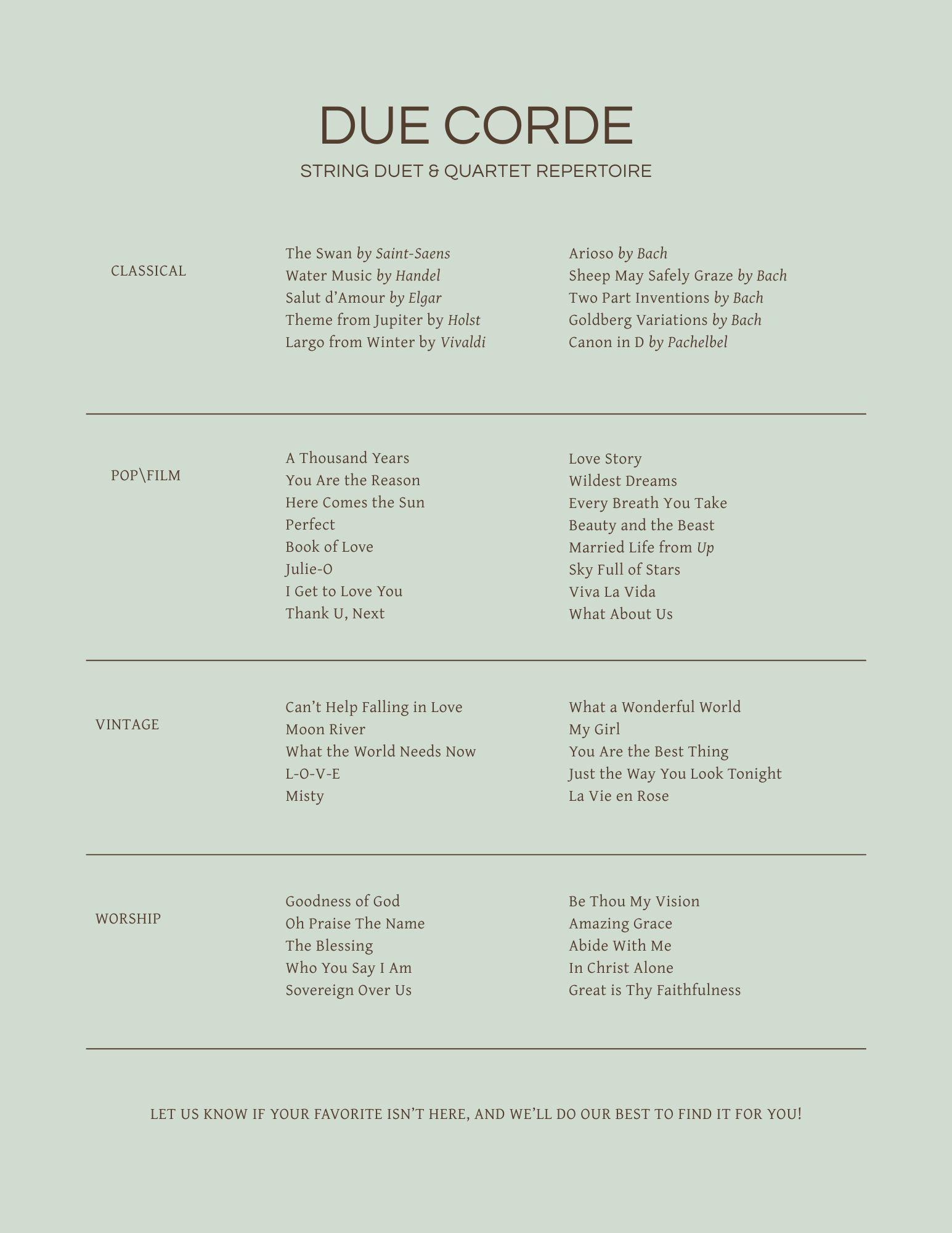 In addition to playing for your event, we will work with you to create a meaningful setlist. For wedding ceremonies, this includes a prelude while your guests are seated, processionals, special music within the ceremony, and recessional.